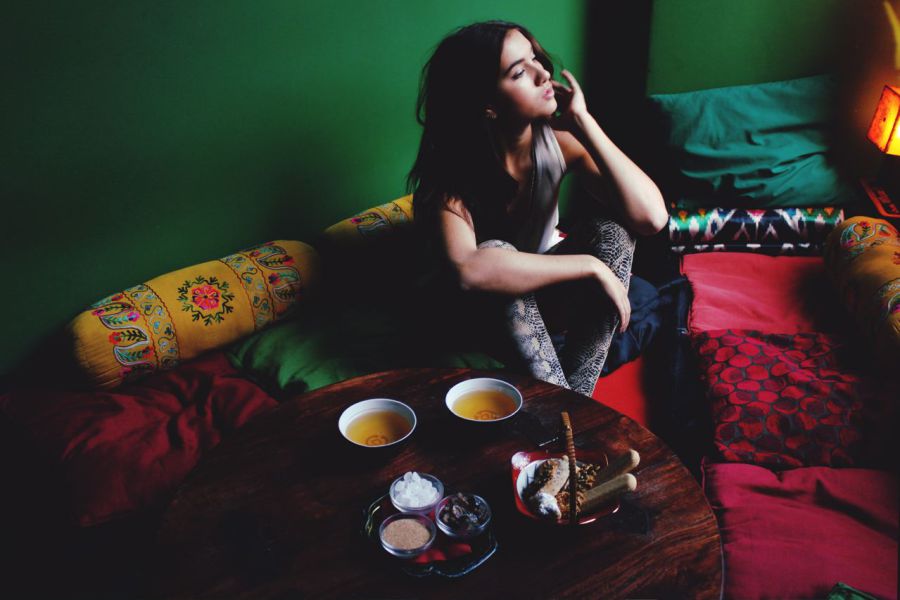 Sie nehmen auf traditionelle Weise Platz auf Sitzkissen an flachen Tischen